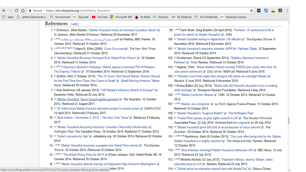As we grow older and advance in school, we use the internet more and more. It's important for us to know how to use the internet safely and efficiently. For example, a very popular website that students like to use is Wikipedia. Wikipedia is an online encyclopedia that has information on practically everything. However, even though Wikipedia gives information for free, it is also possible for unqualified people to edit and create information on Wikipedia. This make the information on Wikipedia unreliable. I think that Wikipedia is not a good site to base your entire research. However, I think Wikipedia is a good starting place for your research. Let's say you are researching about Malala Yousafzai. Instead of going to her Wikipedia page and basing your research off that, you can scroll down and look at the sources that were used.